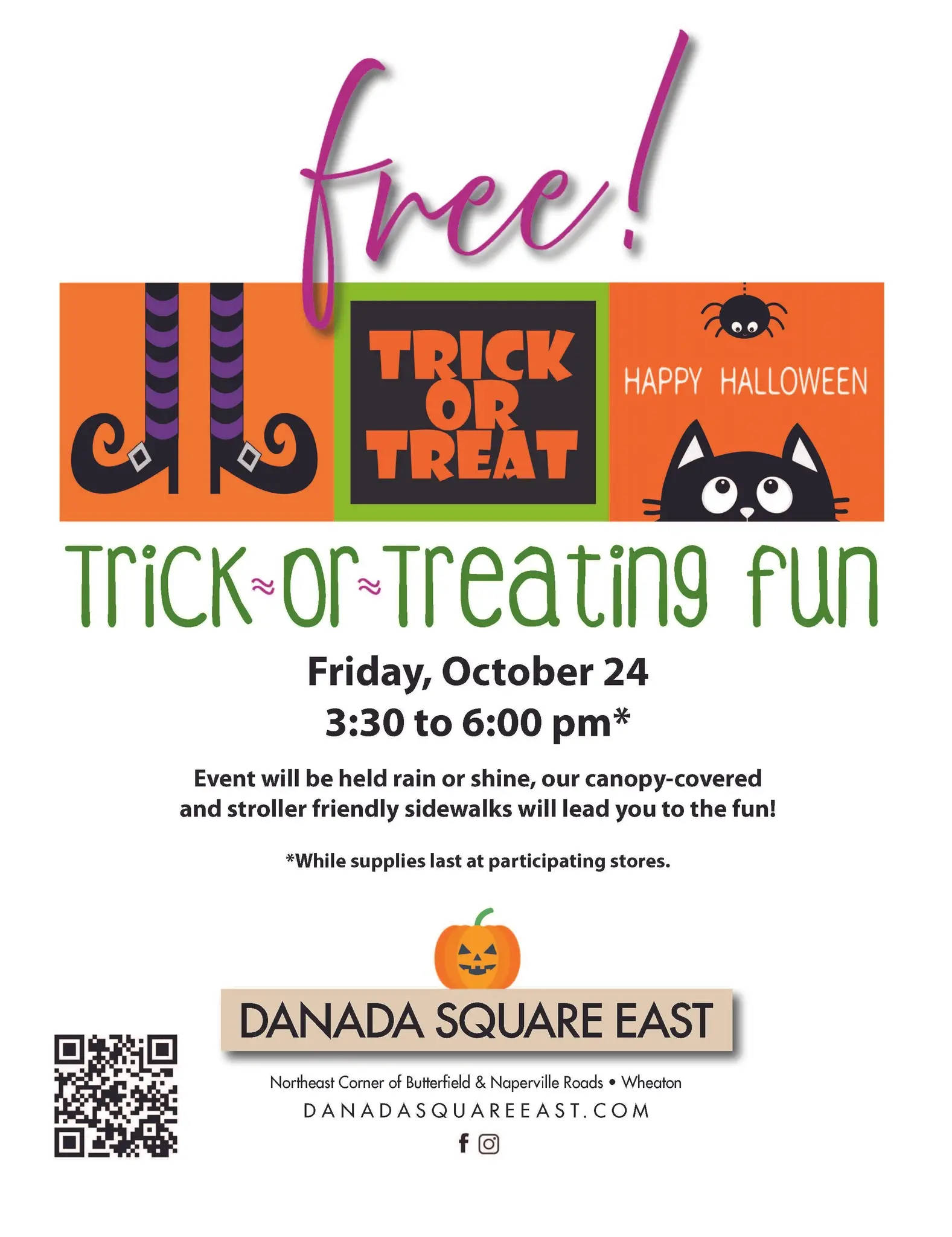 Gather your friends and family on Friday, October 24th for store-to-store trick or treating from 3:30 to 6 pm* at Danada Square East shopping center. You’ll find treats at over 20 stores including Whole Foods, Nordstrom Rack, Sierra, J.Crew Factory, Blick Art and Petco. Our stroller-friendly sidewalks will lead you to the FREE fun, Danada Square East is located on the northeast corner of Naperville Road and Butterfield Road in Wheaton. *while supplies last at participating stores.